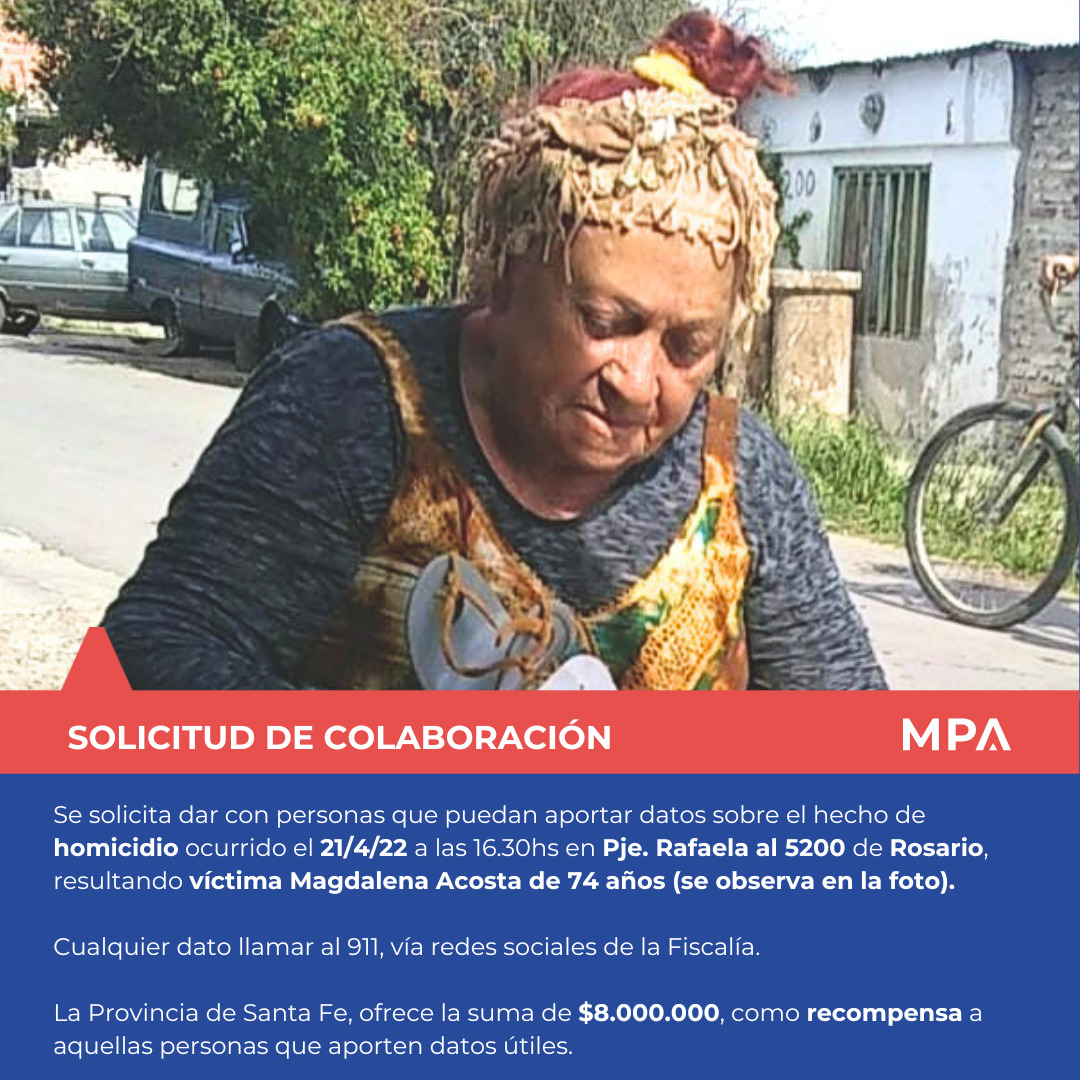 Se solicita la colaboración de la población para dar con personas que puedan aportar datos en relación a la investigación por el homicidio de Magdalena Acosta de 74 años, ocurrido el 21 de abril del 2022 en calle Pje. Rafaela al 5200 de Rosario, aproximadamente a las 16:30hs, cuando cuatro masculinos a bordo de dos motocicletas pasaron frente al domicilio de la víctima y efectuaron múltiples disparos de arma de fuego contra las personas que se encontraban en la vereda. La Provincia de Santa Fe, ofrece la suma de $8.000.000.,…