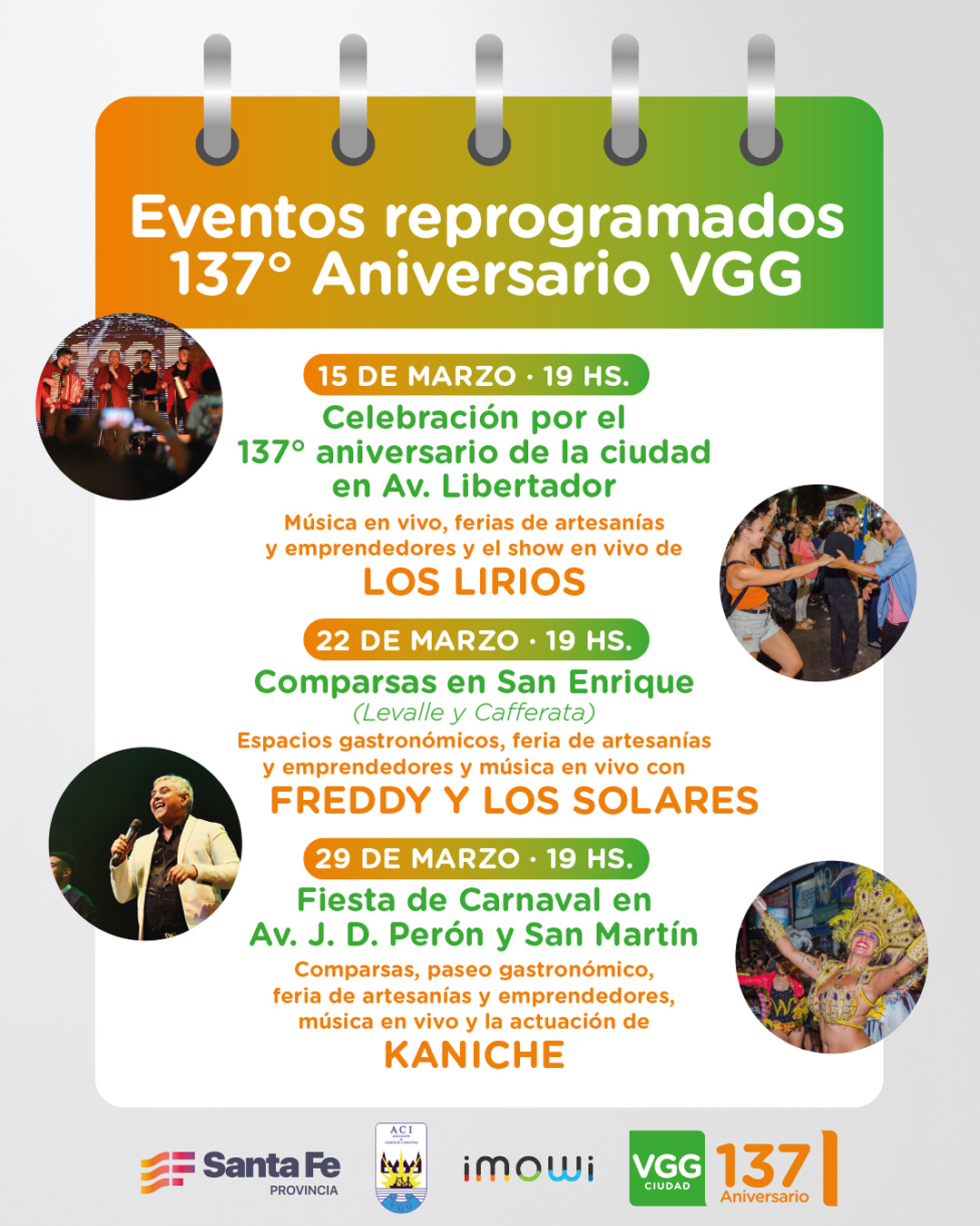 La Municipalidad de Villa Gobernador Gálvez informa que, a raíz de los pronósticos de lluvia para el fin de semana largo, se verán reprogramados los eventos anunciados en el marco del 137 aniversario de la ciudad. Se trata de las celebraciones anunciadas para los días 28 de febrero en San Enrique; 1 de marzo en Av. Juan Domingo Perón; y 2 de marzo en Avenida Libertador.