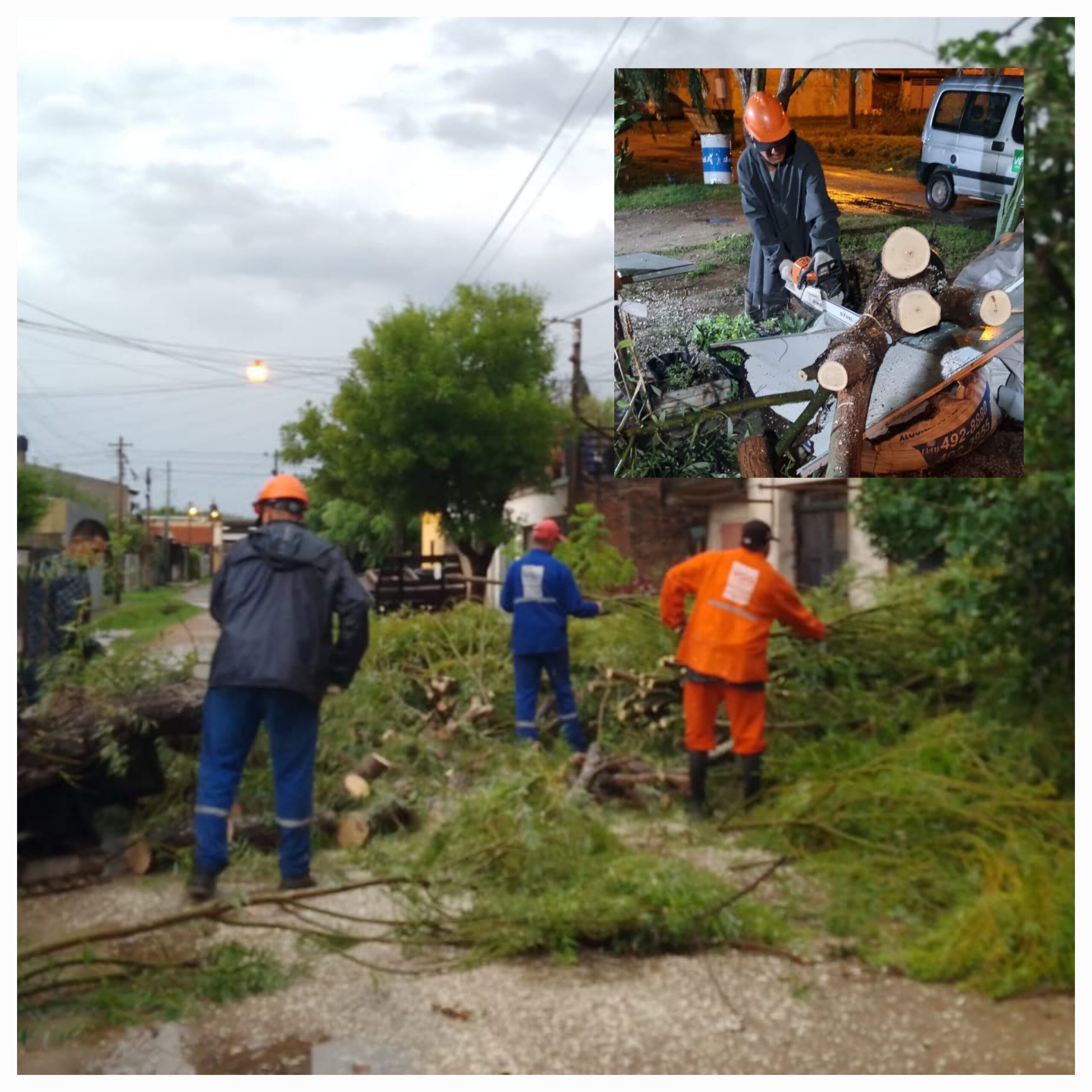 Desde anoche, cuadrillas municipales de las áreas de Servicios Públicos y Control y Convivencia Ciudadana, más Bomberos Voluntarios, la Cooperativa Telefónica y la Cooperativa Integral, trabajan para normalizar la situación lo más pronto posible. Durante el jueves y el viernes, han caído 49 milímetros de agua y se registraron ráfagas de viento de hasta 95 kilómetros por hora.