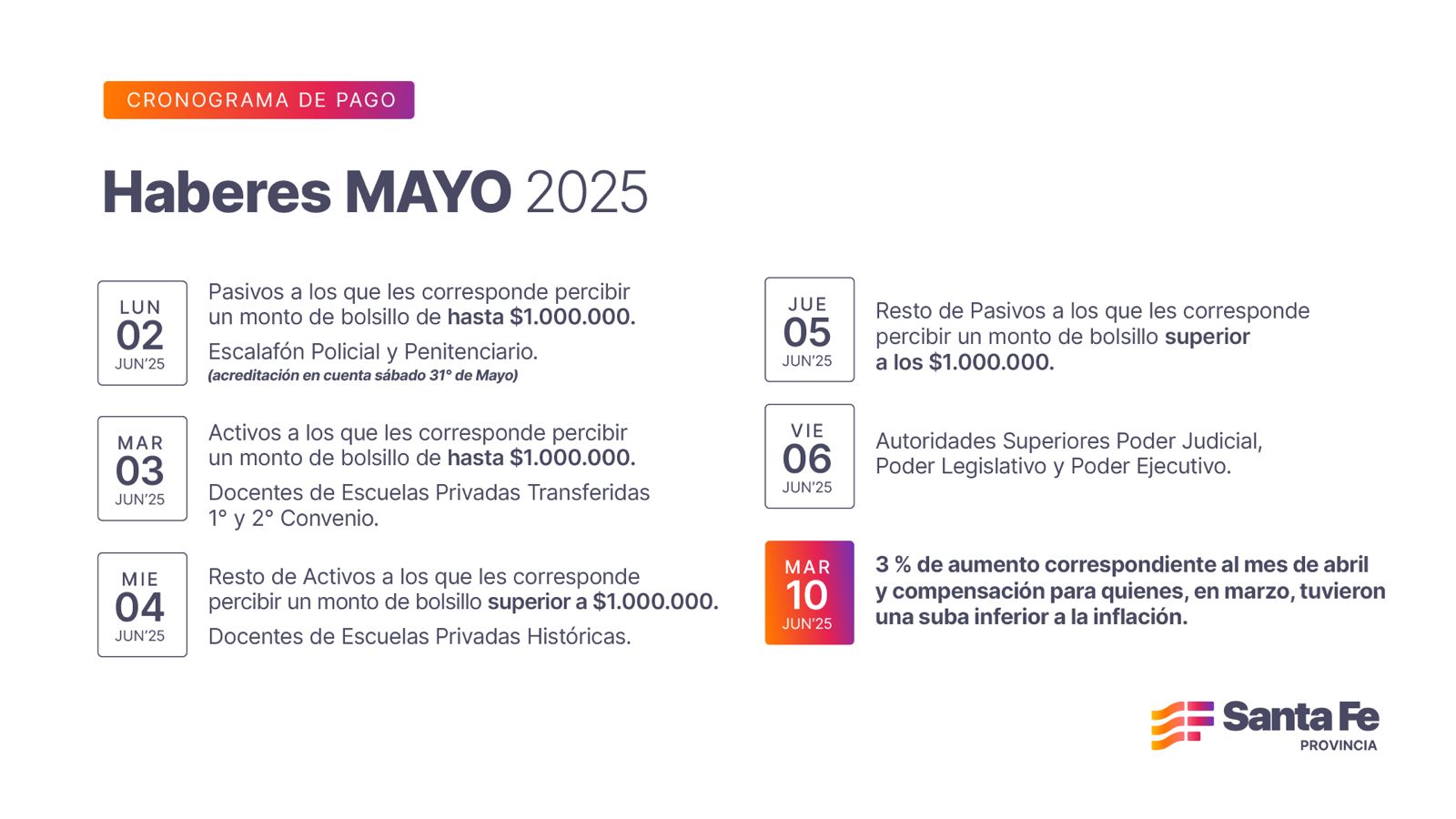El Gobierno Provincial, a través del Ministerio de Economía, informó que los haberes del mes de mayo se percibirán a partir del lunes 2 de junio (el primer turno correspondiente al escalafón policial, penitenciario y pasivos que cobren hasta $ 1.000.000 lo tendrá acreditado el sábado 31 de mayo), finalizando el cronograma de pago el viernes 6.