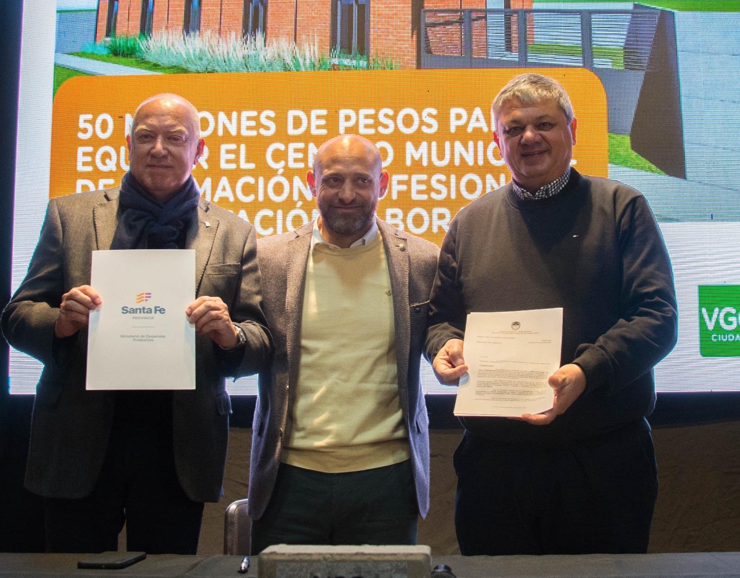 La Municipalidad de Villa Gobernador Gálvez, representada por el intendente Alberto Ricci, y el gobierno de la provincia de Santa Fe, referenciada por Gustavo Puccini, ministro de Desarrollo Productivo, firmaron un convenio por un aporte no reintegrable de $50.000.000 destinado a afrontar y solventar parte de las erogaciones que deriven de la adquisición de maquinarias y herramientas para el equipamiento del Centro Municipal de Formación Profesional y Capacitación Laboral.