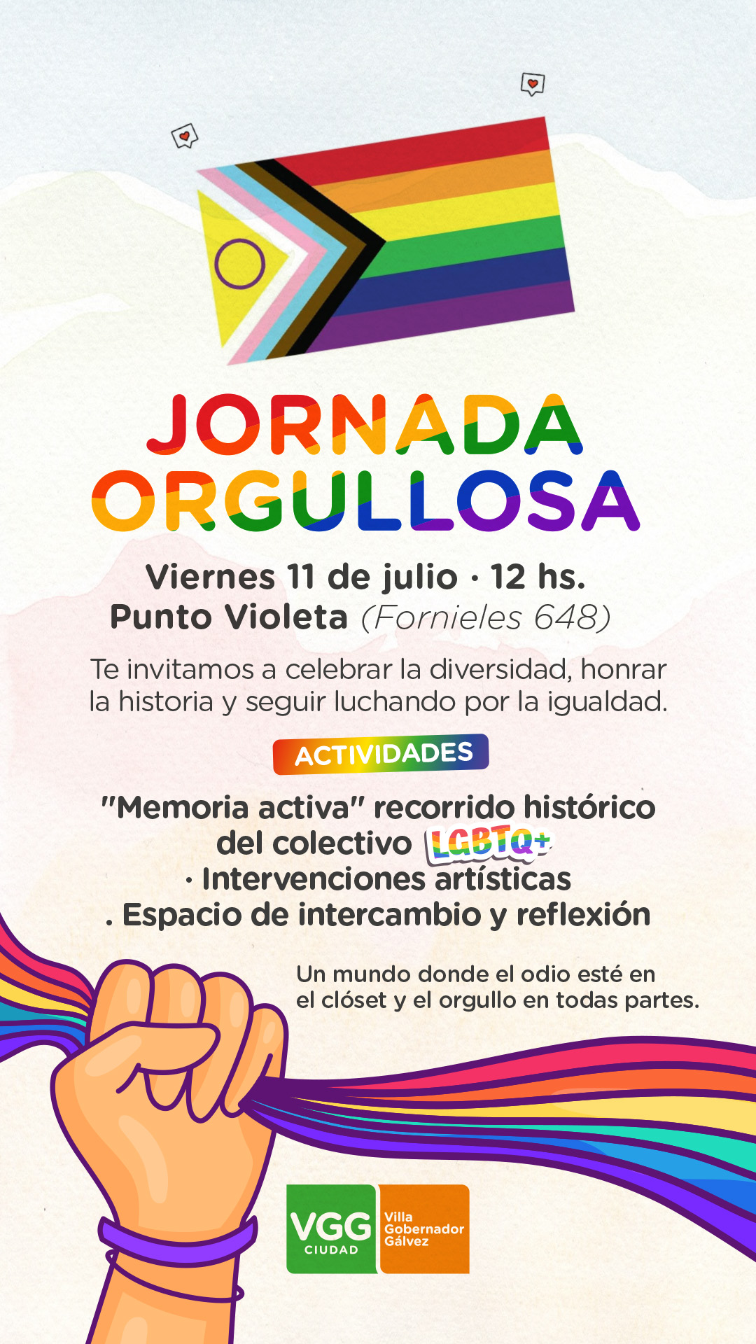 La Municipalidad de Villa Gobernador Gálvez, a través del área de Género y Diversidad y en el marco del Día Internacional del Orgullo LGBTIQ+ que tuvo lugar el 28 de junio, llevará adelante la “Jornada Orgullosa”, con el objetivo de celebrar la diversidad, honrar la historia y seguir luchando por la igualdad. La actividad, abierta y gratuita, se realizará el viernes 11 de julio en el Punto violeta (Fornieles 648) desde las 12 hs. con espacios de “Memoria Activa”, que dará cuenta de un recorrido histórico del colectivo LGBTIQ+, Intervenciones artísticas y Espacios de intercambio y reflexión.
