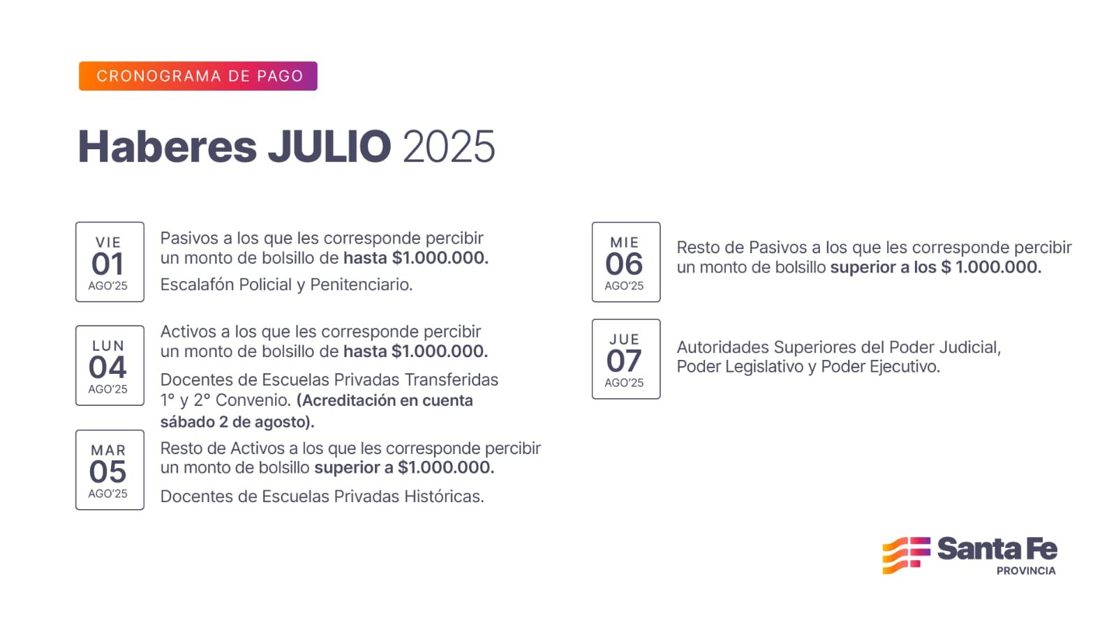El Gobierno Provincial, a través del Ministerio de Economía, informó que los haberes del mes de julio se percibirán a partir del viernes 1 de agosto, finalizando el cronograma de pagos el jueves 7.
