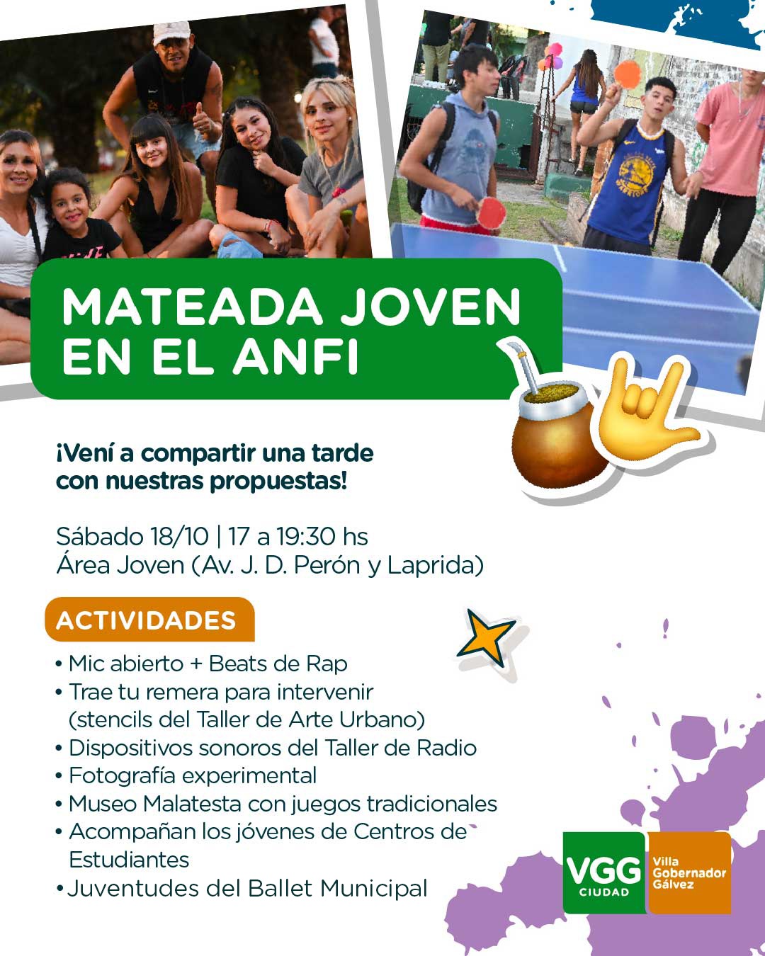 Este sábado 18 de octubre, de 17 a 19:30 horas, el Anfiteatro Municipal será escenario de una edición de “Mateada Joven”, una propuesta impulsada por la Municipalidad de Villa Gobernador Gálvez a través del área joven. Busca generar espacios de encuentro, expresión y participación para las juventudes de la ciudad. La jornada se enmarca dentro de las políticas públicas que promueve el municipio para fortalecer la participación juvenil y el acceso a la cultura. En este sentido, la Mateada Joven propone una tarde abierta, gratuita y pensada para que las…