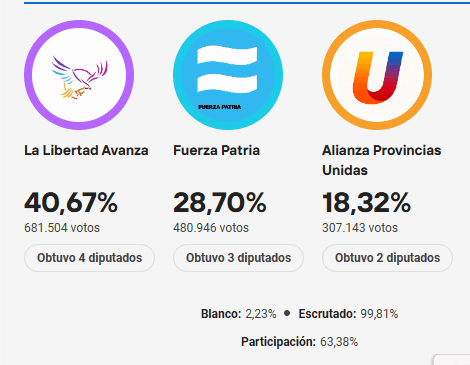 Mientras tanto Fuerza Patria que obtuvo el 28,70% de los votos, se quedó con tres bancas en la Cámara de Diputados. Los diputados electos por esta fuerza son: