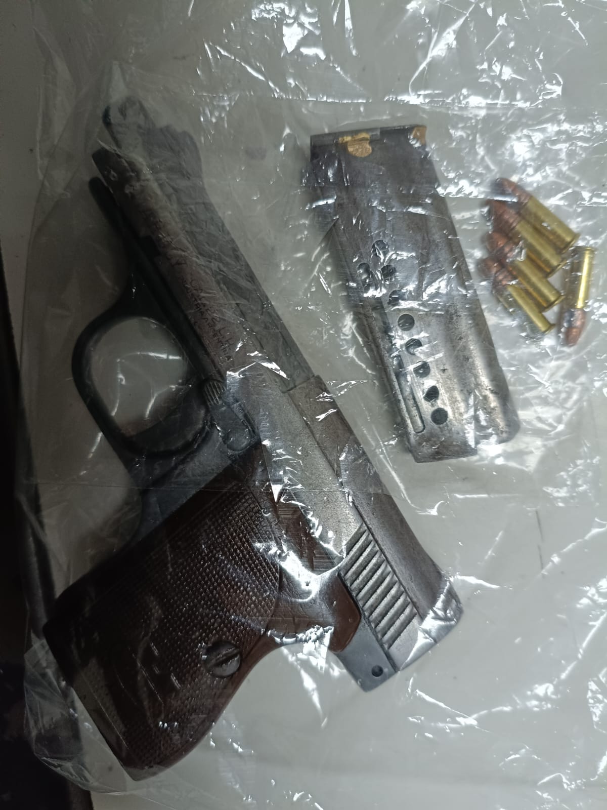 Arma: Una pistola marca Mahely calibre .22 LR, color plateada con cachas marrones.