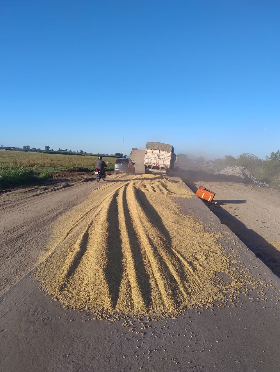 ​Debido a que el cereal derramado representaba un peligro inminente para el tránsito, se activó un protocolo de emergencia con ​Bomberos Voluntarios a cargo del Of. Ayudante Morales Nicolás y Protección Civil con el director Dolce Carlos para despejar la cinta asfáltica.