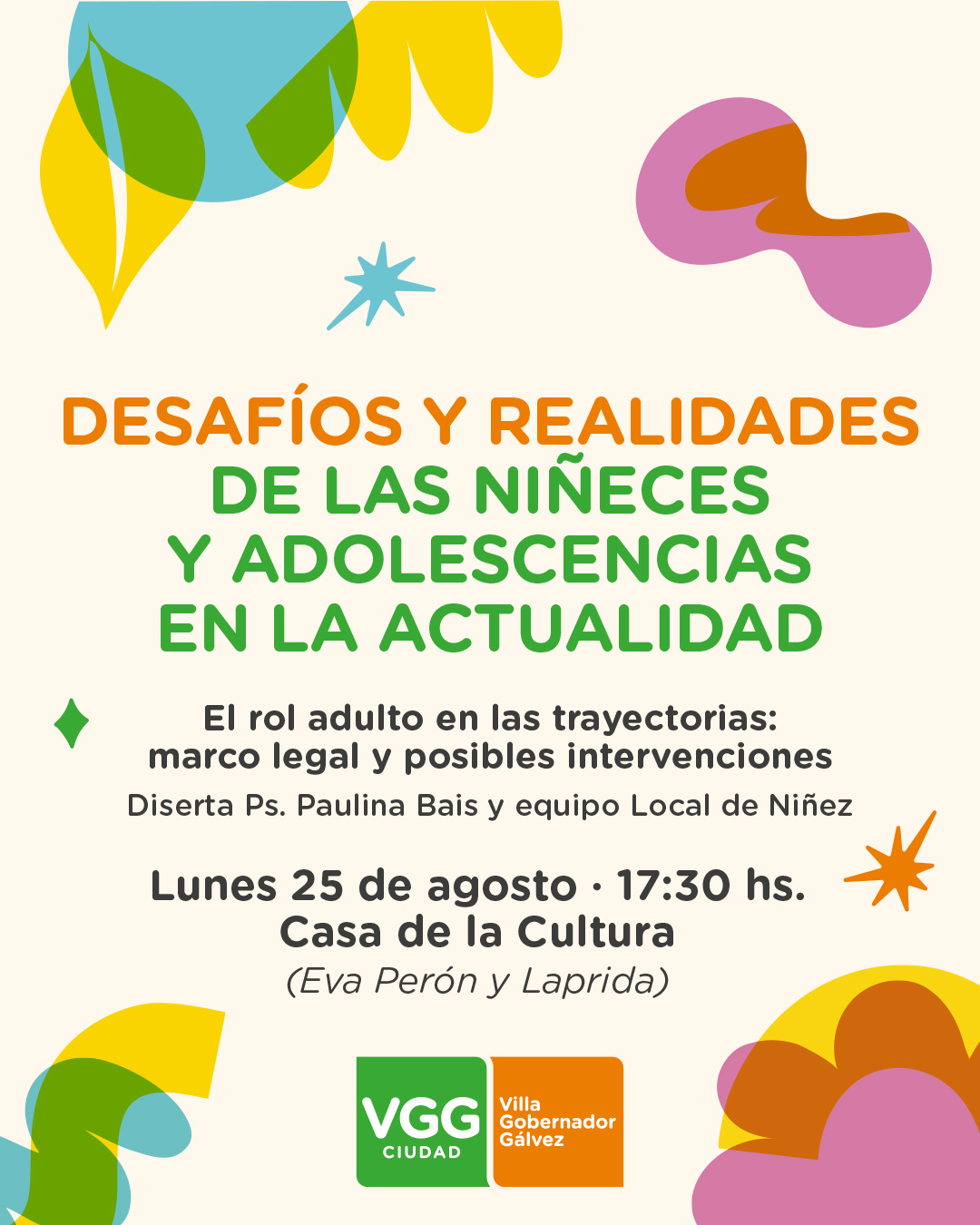 Será el lunes 25 de agosto a las 17:30 horas en la Casa de la Cultura, y la disertación estará a cargo de la Psicóloga Paulina Bais y el equipo local de niñez. Quienes estén interesados deberán anotarse en el link https://forms.gle/s5wcKgkPX5KvknUTA En el marco del “Mes de las infancias”, este lunes 25 de agosto la Municipalidad de Villa Gobernador Gálvez llevará a cabo una charla abierta y gratuita sobre “El rol del adulto en las trayectorias de niños, niñas y adolescentes” en el marco de Las primeras Jornadas sobre…