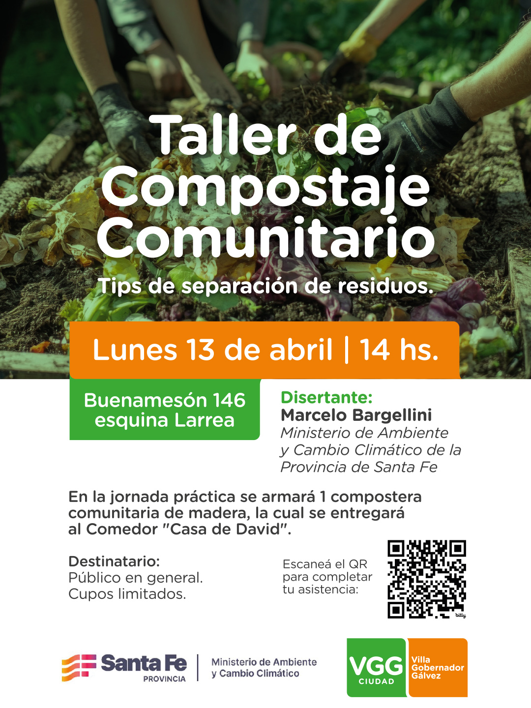 El taller cuenta con el respaldo del Ministerio de Ambiente y Cambio Climático del gobierno de la provincia de Santa Fe y se llevará adelante el lunes 13 de abril a las 14 horas en “Casa David”. Inscripción previa en https://bit.ly/TallerResiduos13-4 La Municipalidad de Villa Gobernador Gálvez y el gobierno de la provincia de Santa Fe, mediante el Ministerio de Ambiente y Cambio Climático, invitan a participar del Taller de separación de residuos y compostaje comunitario. El mismo se llevará a cabo el día lunes 13 de abril a las…